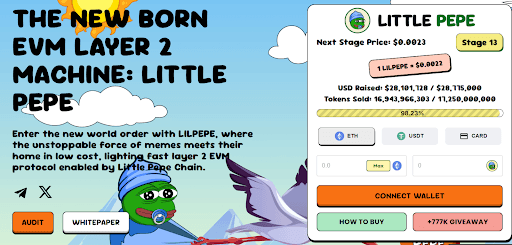 Little Pepe (LILPEPE) has hit another milestone in its development journey, with its ongoing presale having raised an impressive $28,101,728 out of its set target of $28,775,000, thus implying that it is almost at its conclusion. At its current price of $0.0022 per token at Stage 13, investors have acquired an impressive 16,943,966,303 LILPEPE tokens out of a set limit of 17,250,000,000, with a small number remaining before the price increases again.