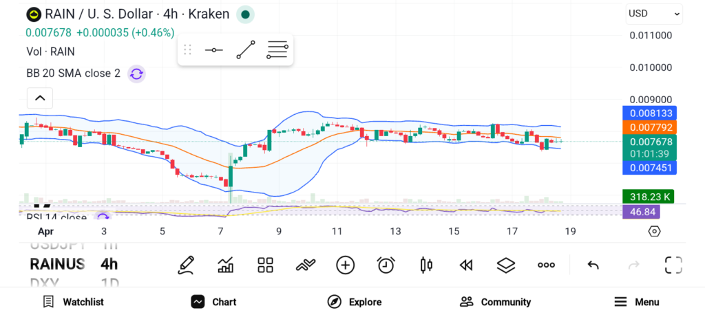 RAIN continues to show strength despite a recent price pullback. The overall trend still looks positive on technical indicators. The Ichimoku Cloud signals ongoing support for upward movement. This structure suggests buyers remain active in the background. RAIN trades about 12.5% below its all-time high of $0.0110. A clean breakout above $0.0110 could confirm renewed strength. If momentum holds, price may extend toward $0.0113. That move would set a fresh all-time high for the token. Still, momentum stability matters for continued upside. Weak buying pressure could shift sentiment quickly. A drop toward $0.0097 would signal fading strength.