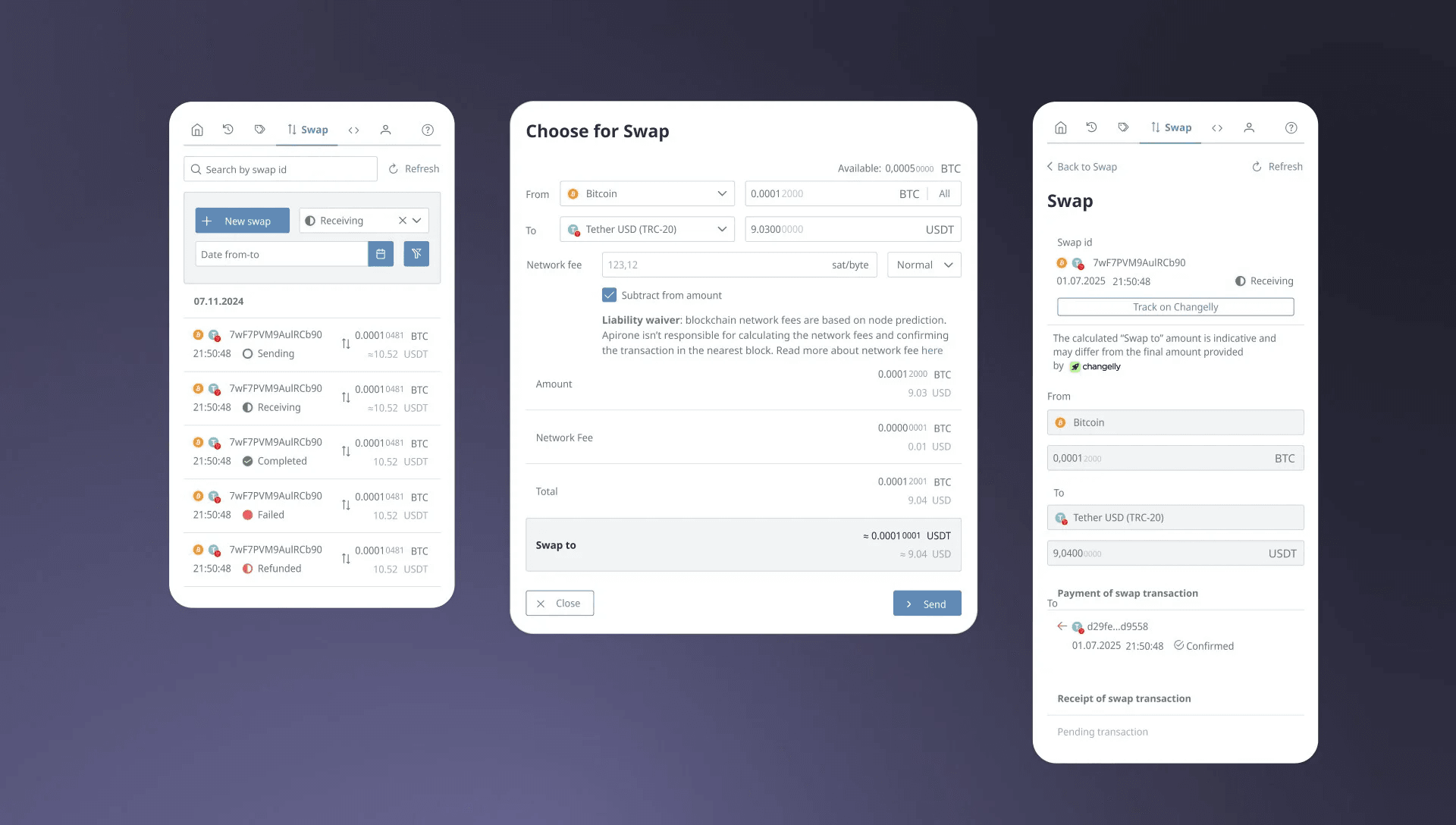 The exchange feature is implemented in partnership with Changelly, which ensures reliable and efficient execution of all transactions. Using Changelly’s liquidity and exchange infrastructure, Apirone offers competitive rates and fast payment processing.