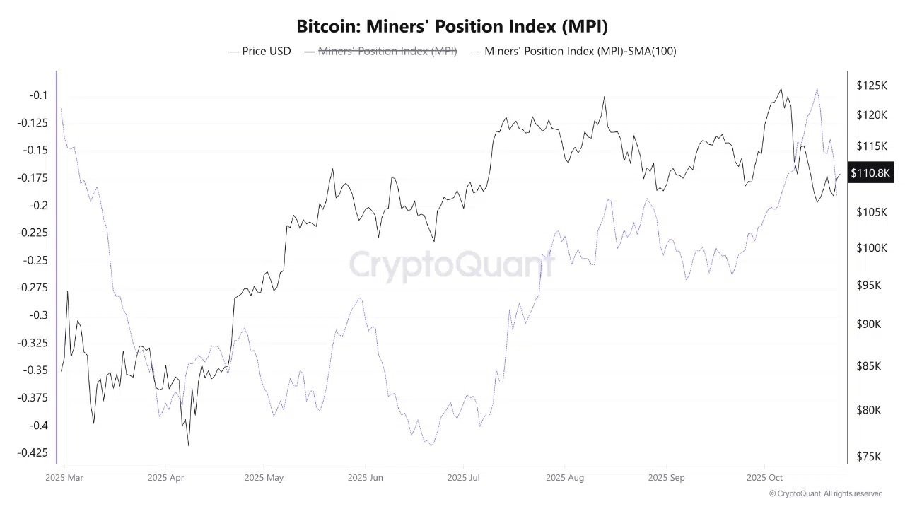 The firm’s Miners’ Position Index (MPI), adjusted by its 100-day moving average, climbed to -0.12 on October 17, marking its highest level since March 2025. While the index remains in negative territory, the steady rise from -0.41 in June signals a meaningful change in miner behavior as Bitcoin’s price holds above $110,000.