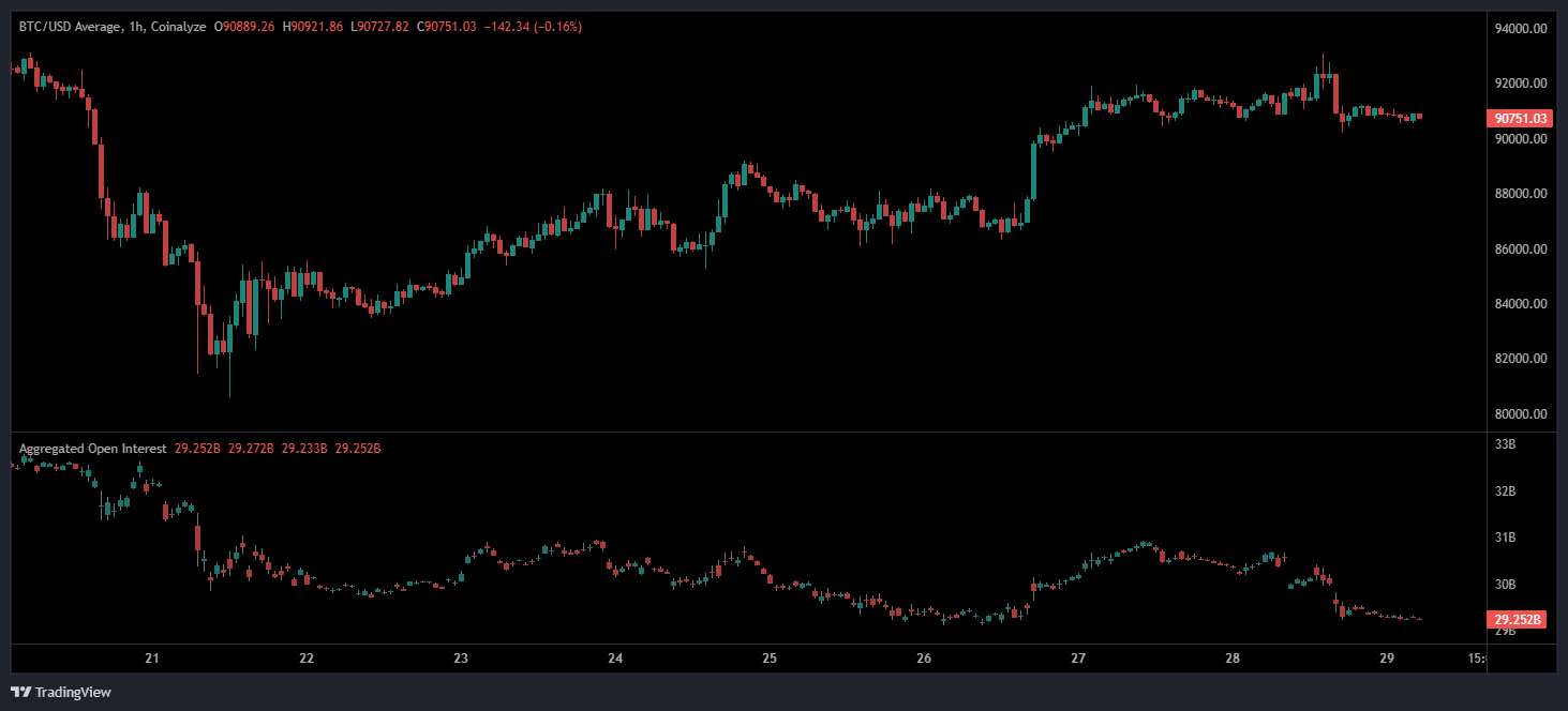 Open Interest has trended lower throughout the displayed period, falling toward 29.25B, reflecting reduced leveraged exposure and the unwinding of long-side positions. The decline aligns with the broader slowdown in directional conviction as both long and short positions decreased.