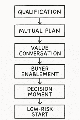 Once the deal is real, you move into creating a mutual plan. This is where you and the buyer literally agree on how you’ll get from “this looks interesting” to “we’re signed.” Dates, steps, and people – make sure everything is out in the open. Buyers actually appreciate this more than we think; it makes their lives easier and removes the fear of getting it wrong.