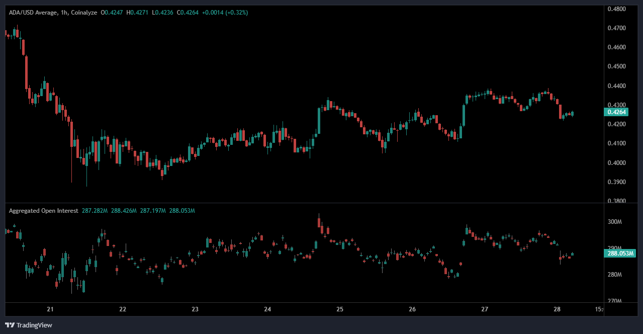 During the displayed period, the crypto fluctuated between $0.4336 and $0.425, forming a clear intraday downtrend.