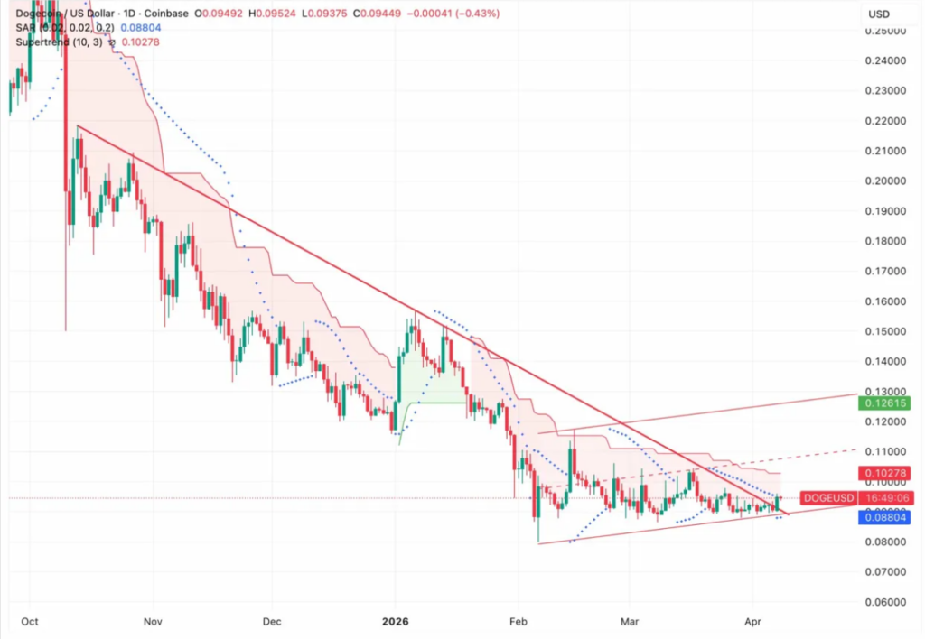 Dogecoin traded at $0.0945 on April 8, staying below a key resistance zone defined by a descending channel that has guided price action since October 2025. The upper boundary near $0.1050 continues to reject upward moves. Consequently, price remains trapped in the lower half of the structure.