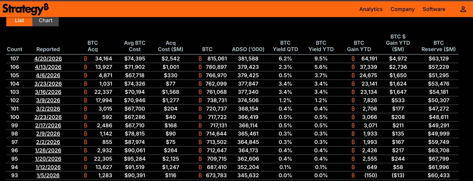 As of April 20, Strategy has 815,061 BTC, with the latest buy amounting to close to $2.54 billion for 34,164 BTC. The total holdings of Strategy amount to 3.88% of the total 21 billion BTC supply in the world.