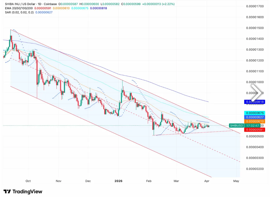 Shiba Inu traded at $0.0000059 on April 3, holding within the lower section of a descending channel that has guided price action since September 2025. Price continues to move without strong momentum as resistance levels remain intact.