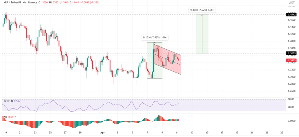 Technical indicators suggest that XRP may be preparing for a breakout. Additionally, a bull flag formation on shorter timeframes points to growing upward pressure. A move above the $1.36 resistance level could push prices toward $1.47.