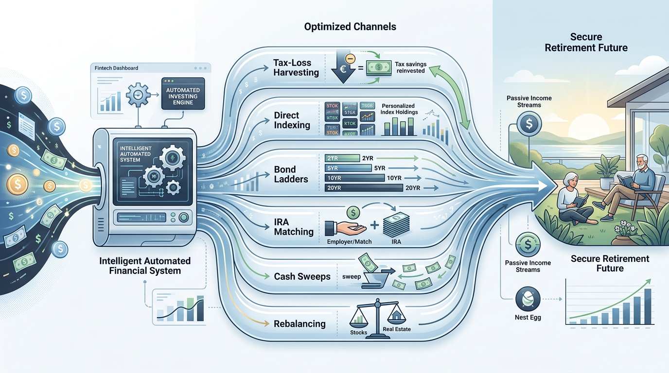 The analysis provided in this report suggests that the “optimal” 2026 retirement plan is one that layers multiple automated strategies. The foundational layer consists of a high-yield cash account with automated waterfalls into a tax-optimized brokerage core. The second layer utilizes Direct Indexing and daily tax-loss harvesting to maximize after-tax returns. Finally, the withdrawal layer employs proportional distributions and RMD tax hacks to ensure the longevity of the nest egg.