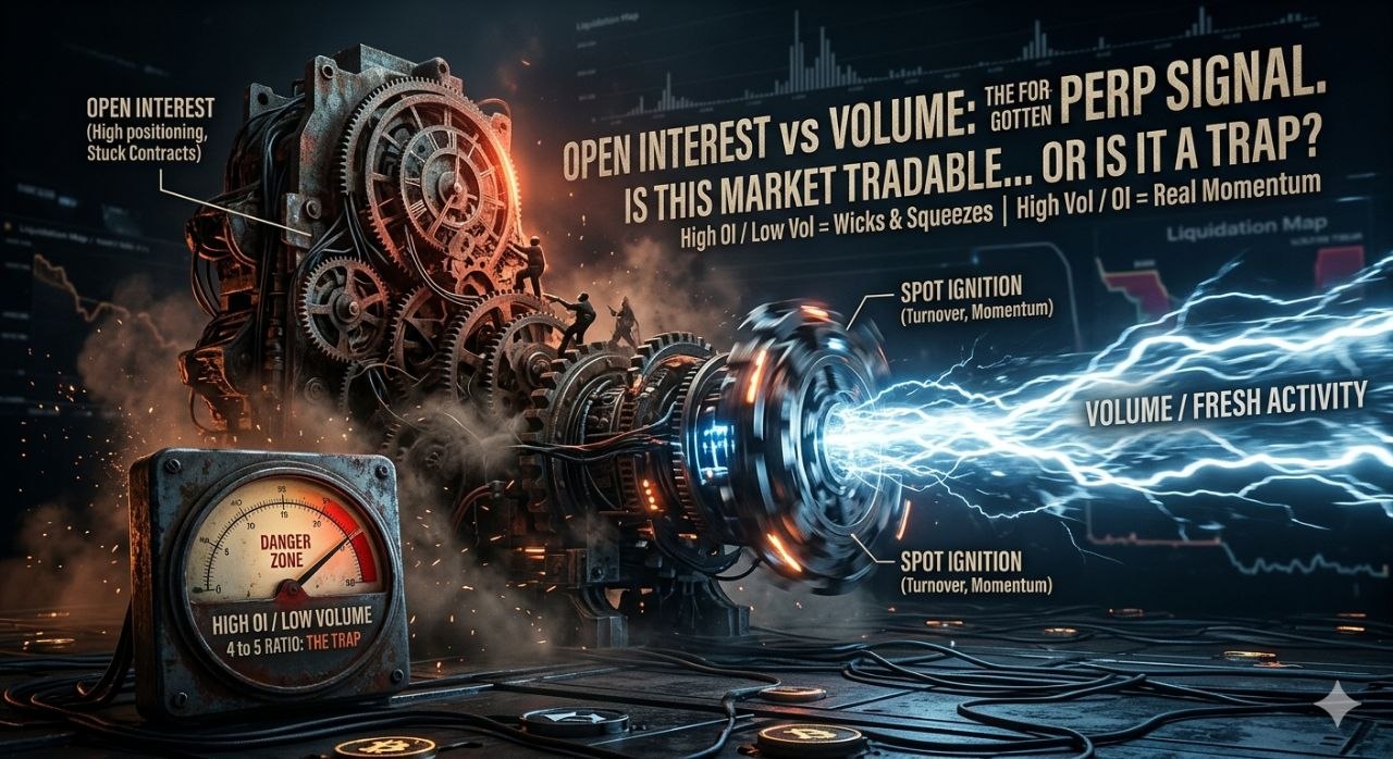 In 2021, perp traders were not trading narratives. They were hunting micro-edges in markets that moved too fast for stories. One of those edges was simple, brutal, and strangely under-credited today: Open Interest vs Volume.