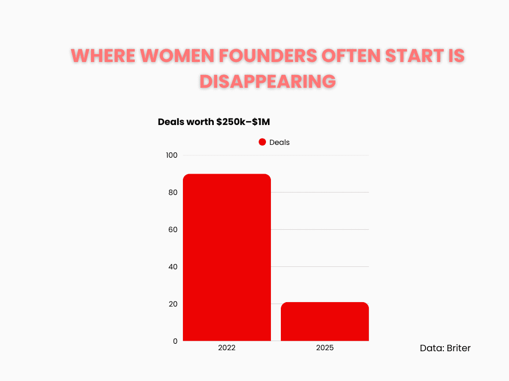 The exclusion is compounded by the kinds of deals that are vanishing. In 2022, there were 90 transactions in the $250,000–$1 million bracket – the range where many female-led ventures first gain traction. By 2025, that number had collapsed to just 21 deals.