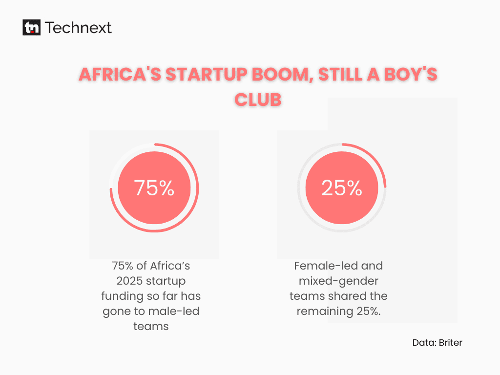 In 2025, three out of every four venture dollars in Africa have gone to male-led startups. According to Briter’s latest report, 75% of all funding raised so far this year flowed to companies founded and run primarily by men, while women-led and mixed-gender teams shared the remainder.
