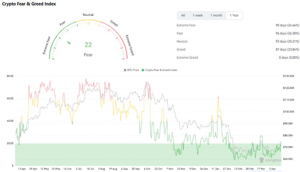 As per CoinGlass, the Crypto Fear & Greed Index has spent roughly a quarter of the past year in the “Extreme Fear” and another quarter in the “Fear” zone.