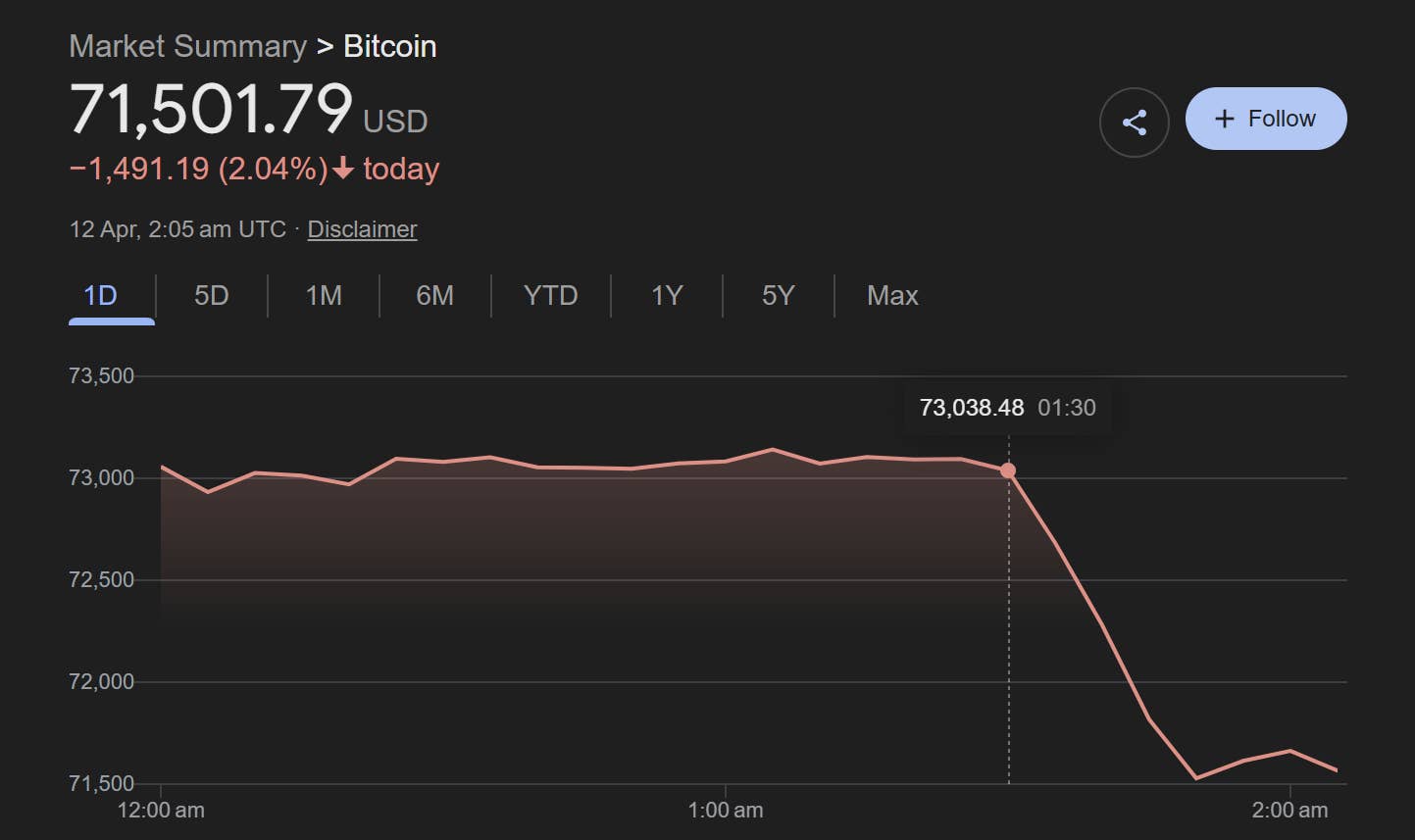 Bitcoin instantly fell to around $71,500 on April 12, down roughly 2% on the day, according to market data.