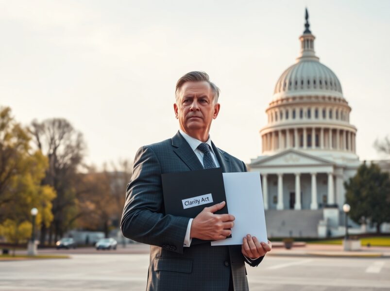 The Clarity Act is proposed legislation that would establish a comprehensive regulatory framework for cryptocurrency markets in the United States. It defines which digital assets qualify as securities versus commodities and clarifies regulatory jurisdiction between the SEC and CFTC.